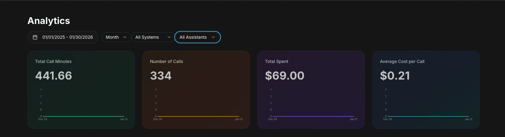 Analytics dashboard — usage trends, API call volume, and performance metrics over time