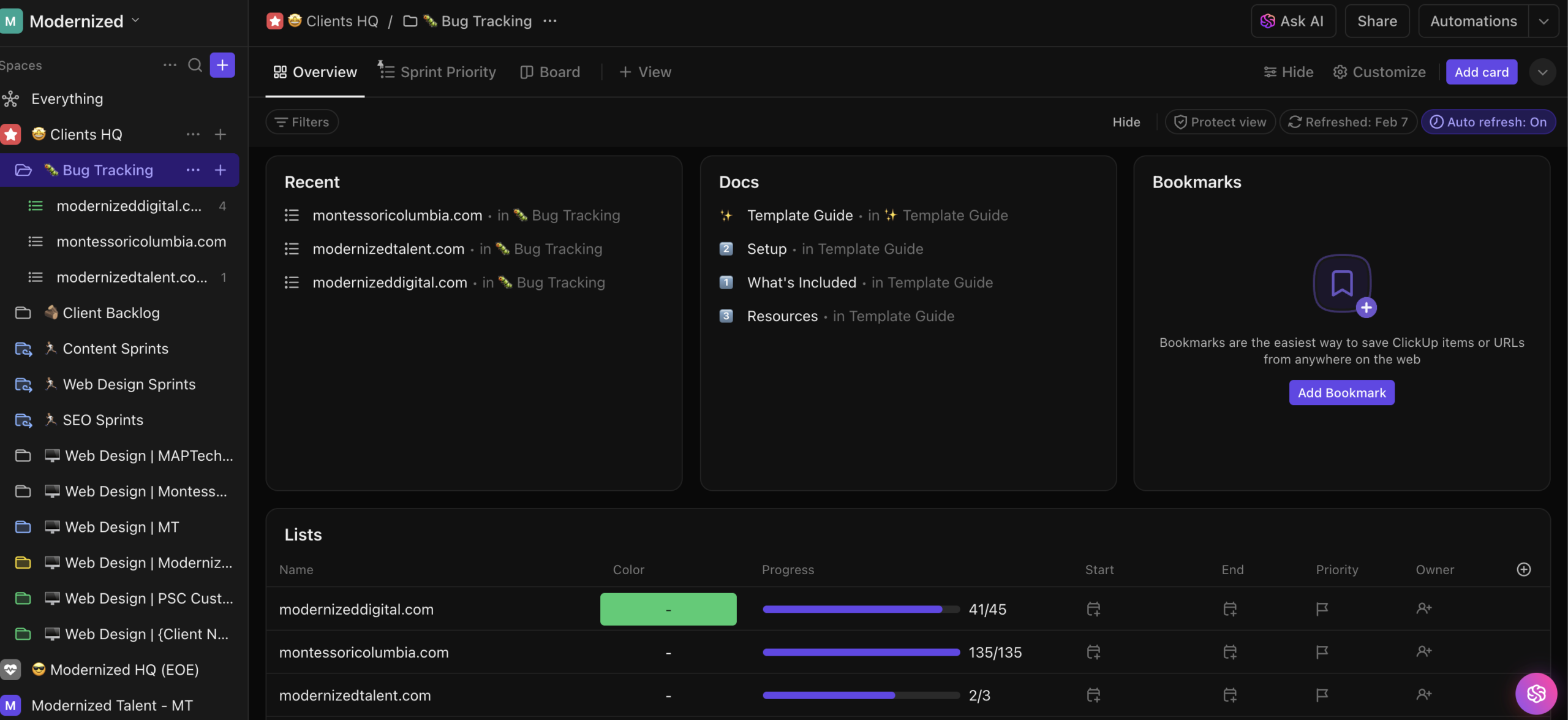 Built the complete project system in ClickUp with custom task templates, status triggers, and Make.com automations — Slack alerts, client updates, and sprint reports all triggered automatically.
